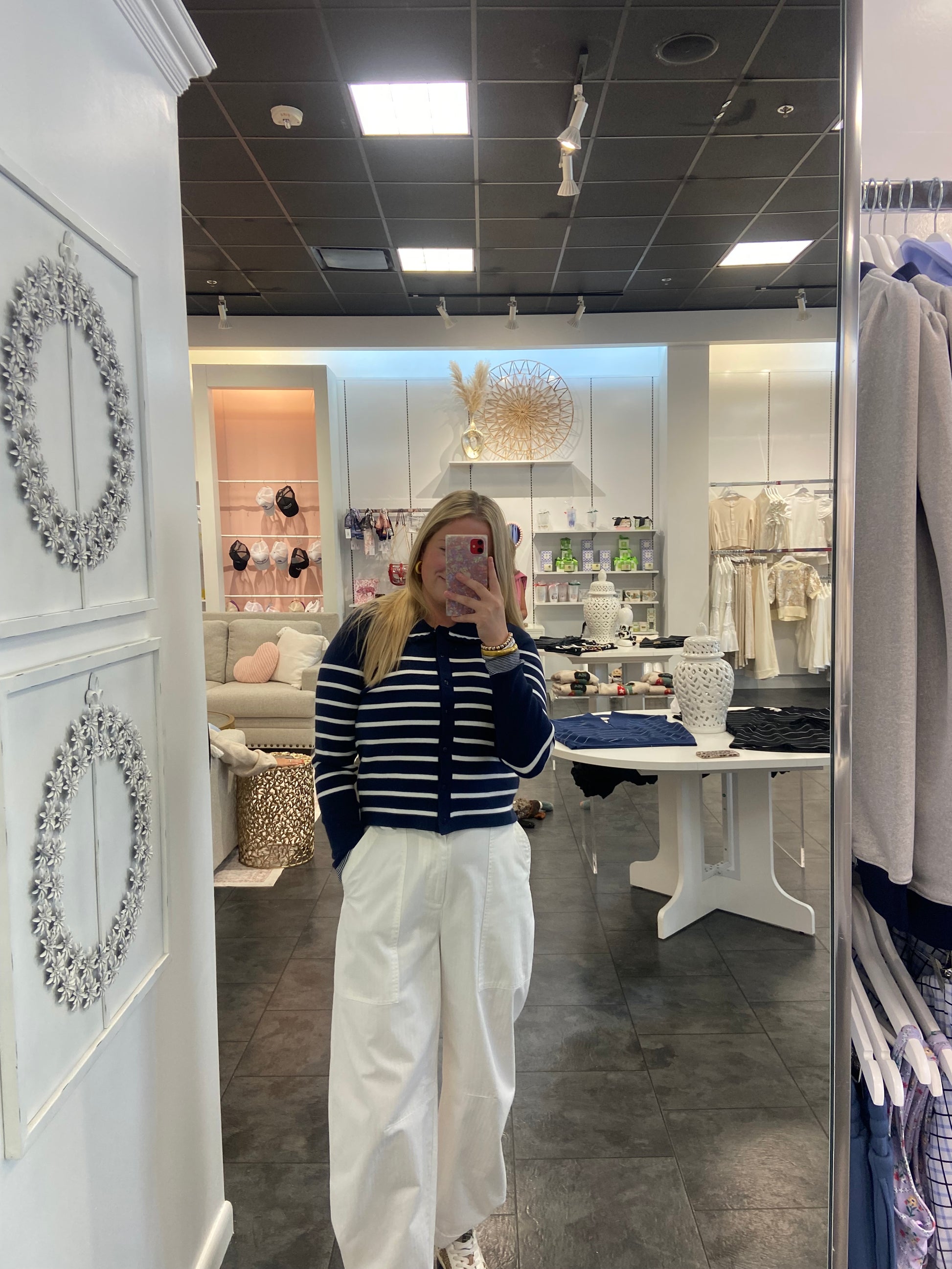 Navy with White Stripe Button Up Ruffle Neck Sweater