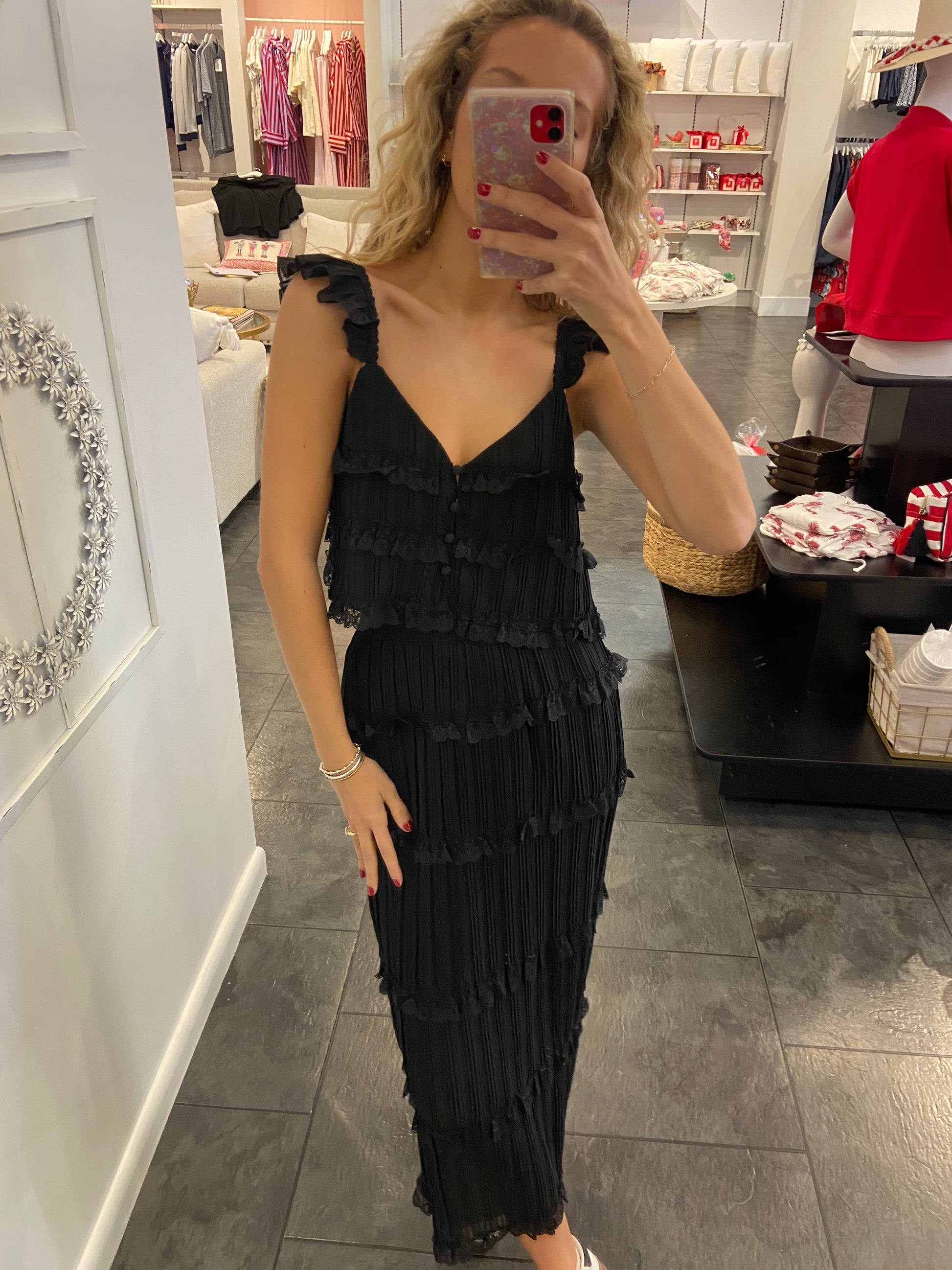 Black Pleated Chiffone top and midi skirt set with lace trim