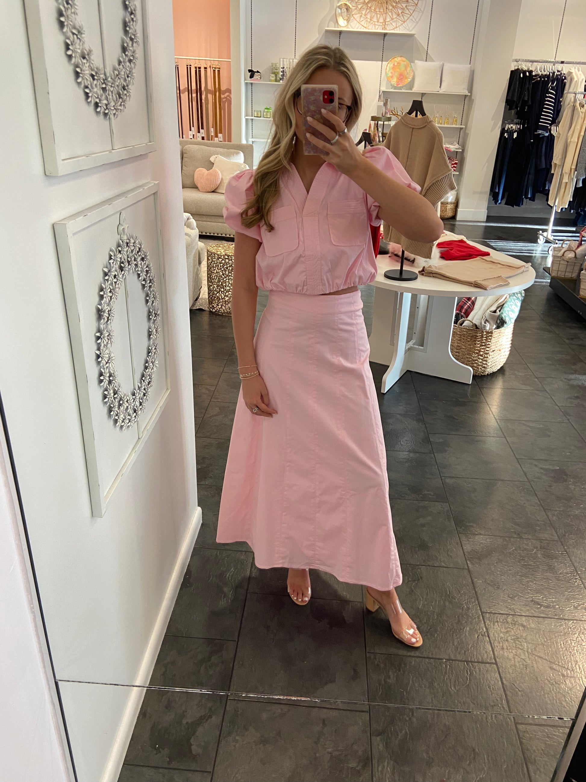 Pink Bubble Sleeve Crop Top and maxi Skirt set