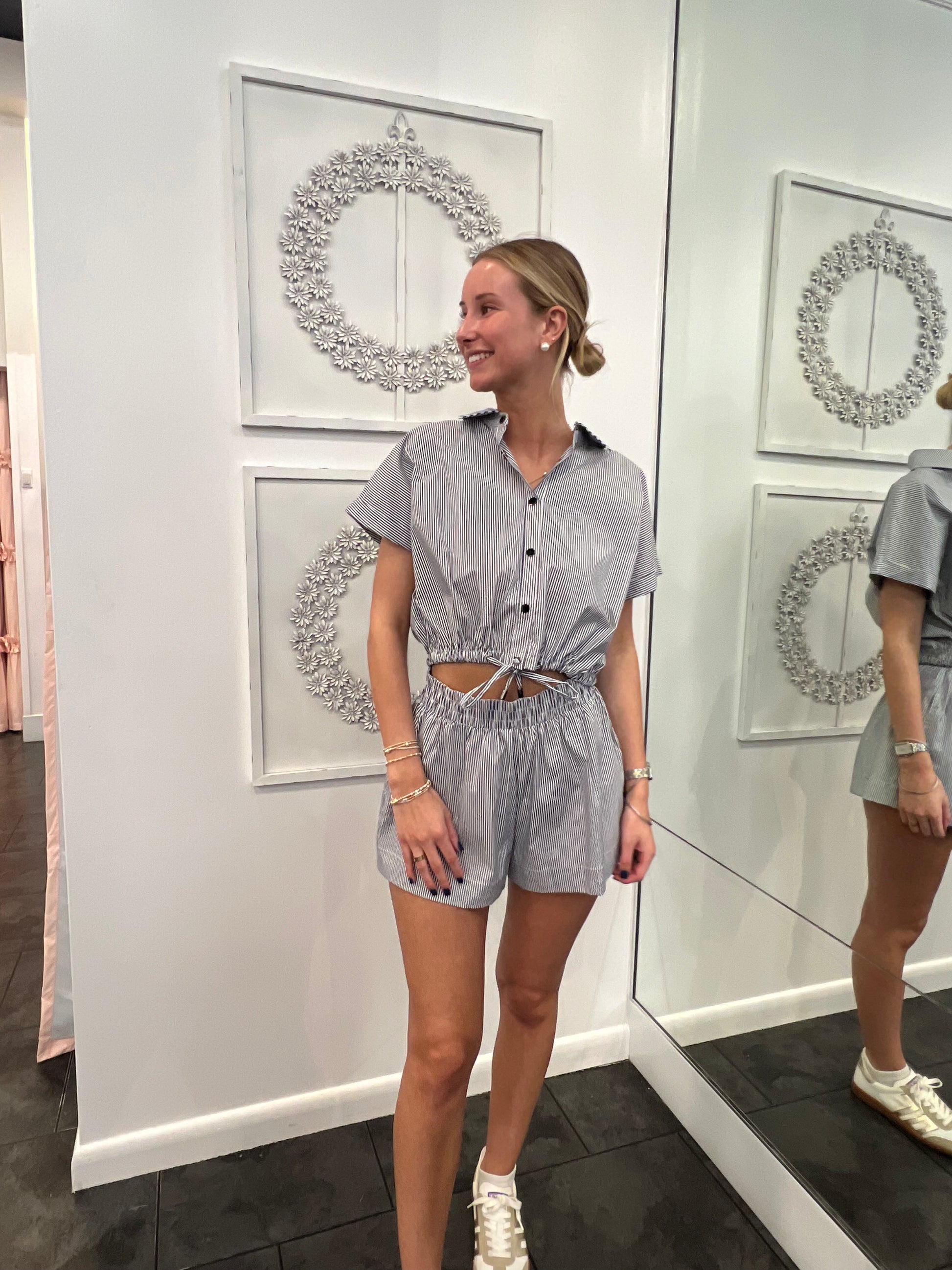 Blue and White Striped button up short sleeve with cinched waist and matching shorts