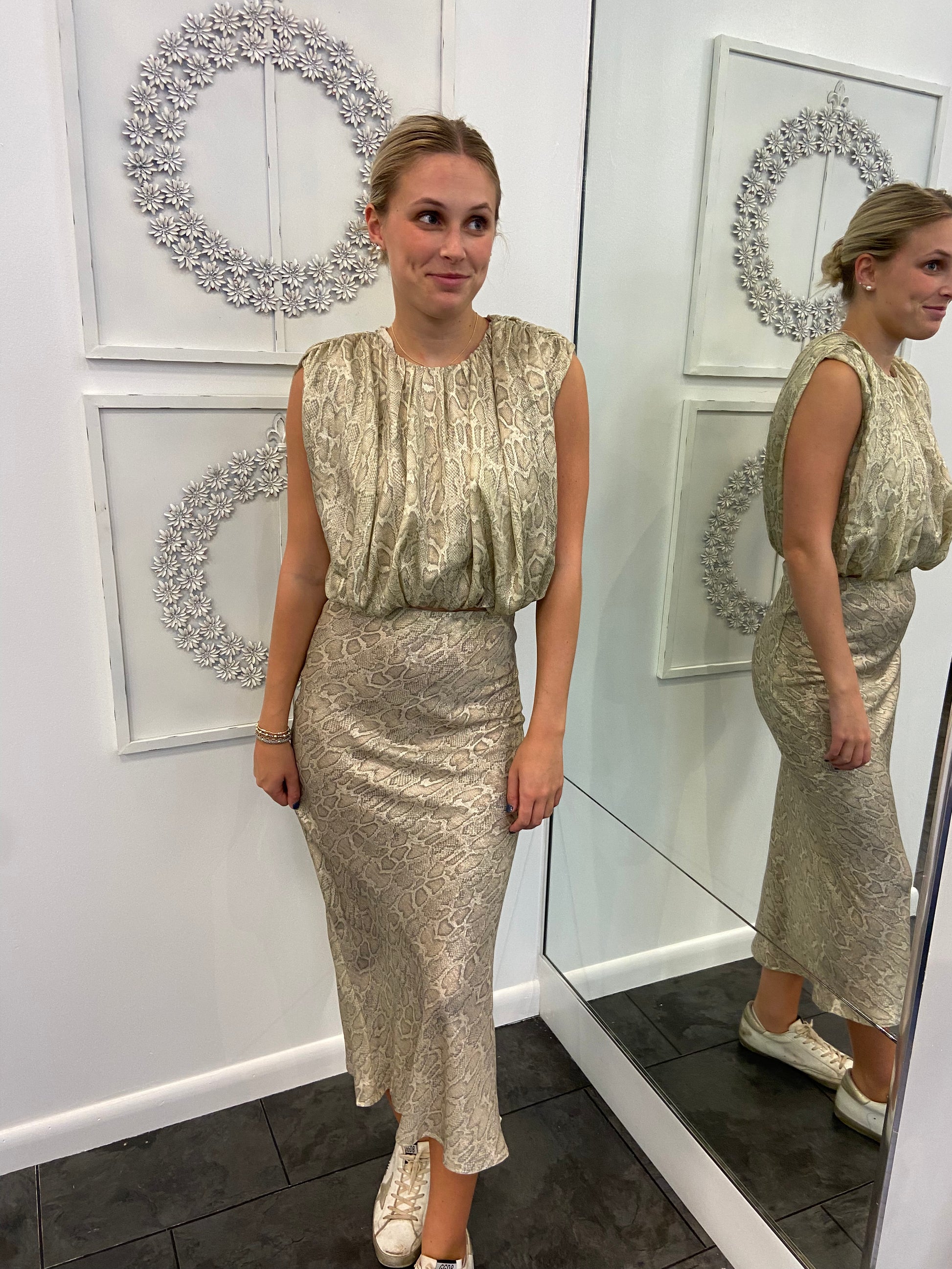cream snake print, has a matching shirt