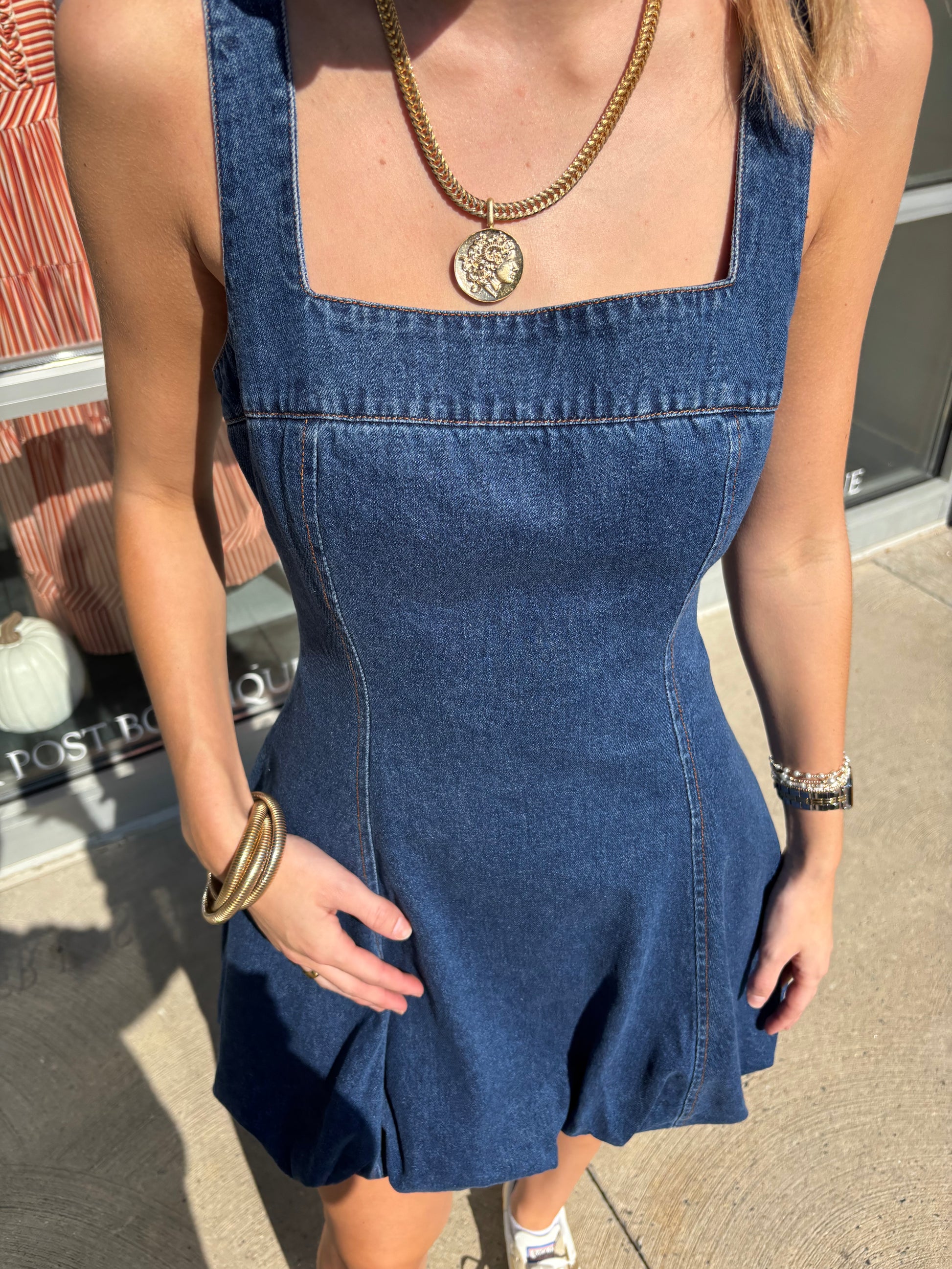 The Emily Dark Denim Square Neck Bubble Hem Dress